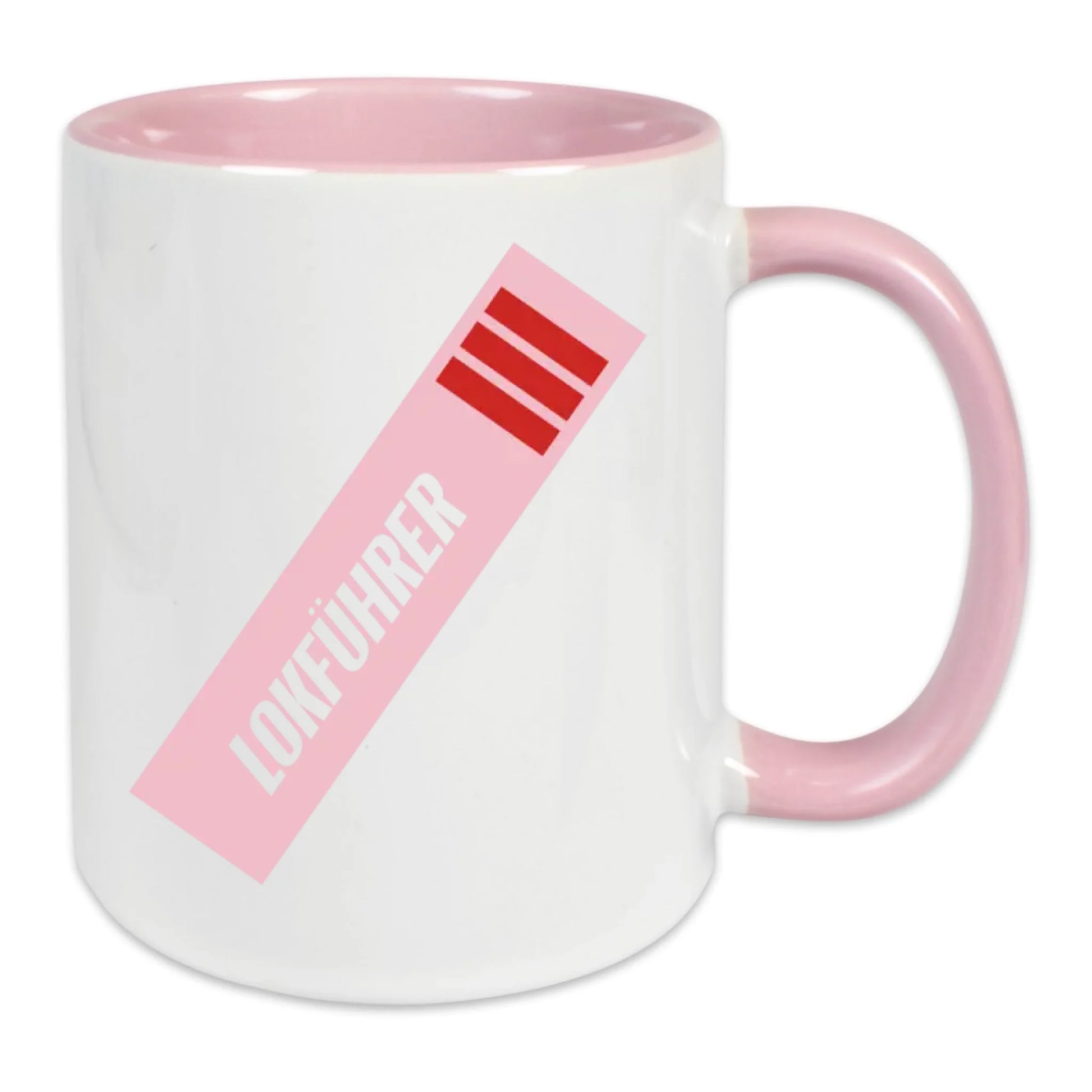 Weiße Keramiktasse mit farbenfroher Innenseite mit gleichfarbigem Henkel. Bedruckt mit Lokführer-Motiv.